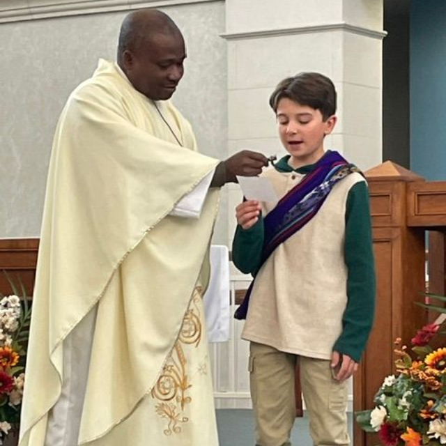 First Communion is celebrated in 3rd grade and Confirmation is celebrated in the Spring of 10th grade.